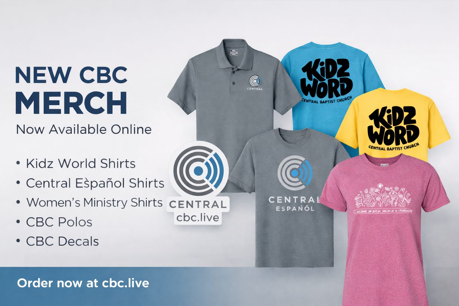 Our new Central Baptist Church merchandise store is now open. You can purchase Kidz World shirts, Central Español shirts, Women’s Ministry shirts, CBC polos, and decals.